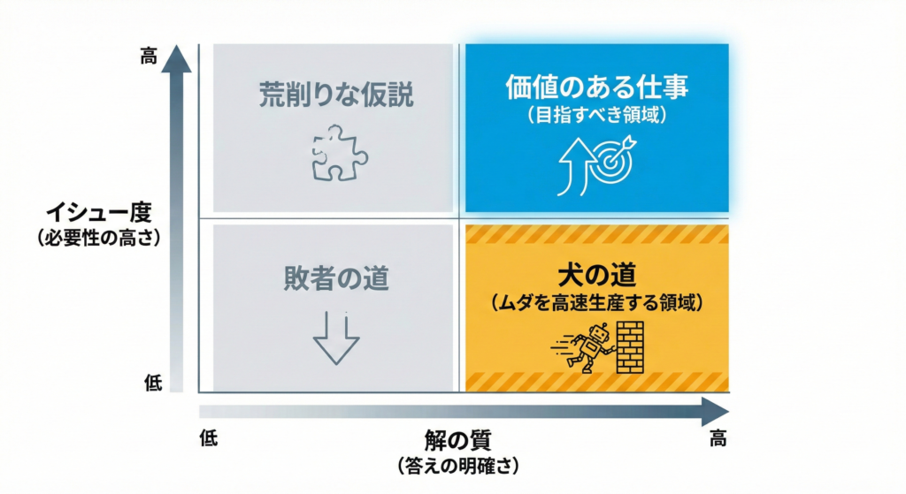 イシューを見極めず、手当たり次第に作業を積み上げて「解の質」だけ上げようとすると、重要な問題に到達できず、意味も成果もない仕事になるとされます。